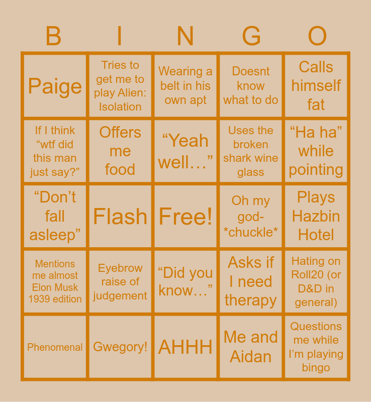 This bingo card has a free space and 29 words: Phenomenal, Sings USSR theme, Flash, Too sober for this, Paige, Wearing a belt in his own apt, Offers me food, Eyebrow raise of judgement, Oh my god- *chuckle*, Gwegory!, Plays Hazbin Hotel, Questions me while I’m playing bingo, AHHH, Me and Aidan, “Ha ha” while pointing, Bozo, “Did you know…”, Mentions me almost Elon Musk 1939 edition, Calls himself fat, “Don’t fall asleep”, Asks if I need therapy, Says “Pudding” referring to Aidan, Uses the broken shark wine glass, If I think “wtf did this man just say?”, Doesnt know what to do, Tries to get me to play Alien: Isolation, Hating on Roll20 (or D&D in general), “Yeah well…” and Hair in a ponytail.