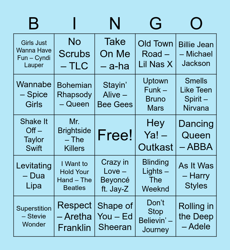 This bingo card has a free space and 24 words: I Want to Hold Your Hand – The Beatles, Respect – Aretha Franklin, Stayin’ Alive – Bee Gees, Superstition – Stevie Wonder, Billie Jean – Michael Jackson, Girls Just Wanna Have Fun – Cyndi Lauper, Wannabe – Spice Girls, No Scrubs – TLC, Hey Ya! – Outkast, Crazy in Love – Beyoncé ft. Jay-Z, Uptown Funk – Bruno Mars, Shake It Off – Taylor Swift, Blinding Lights – The Weeknd, As It Was – Harry Styles, Bohemian Rhapsody – Queen, Don’t Stop Believin’ – Journey, Dancing Queen – ABBA, Take On Me – a-ha, Smells Like Teen Spirit – Nirvana, Mr. Brightside – The Killers, Rolling in the Deep – Adele, Levitating – Dua Lipa, Old Town Road – Lil Nas X and Shape of You – Ed Sheeran.