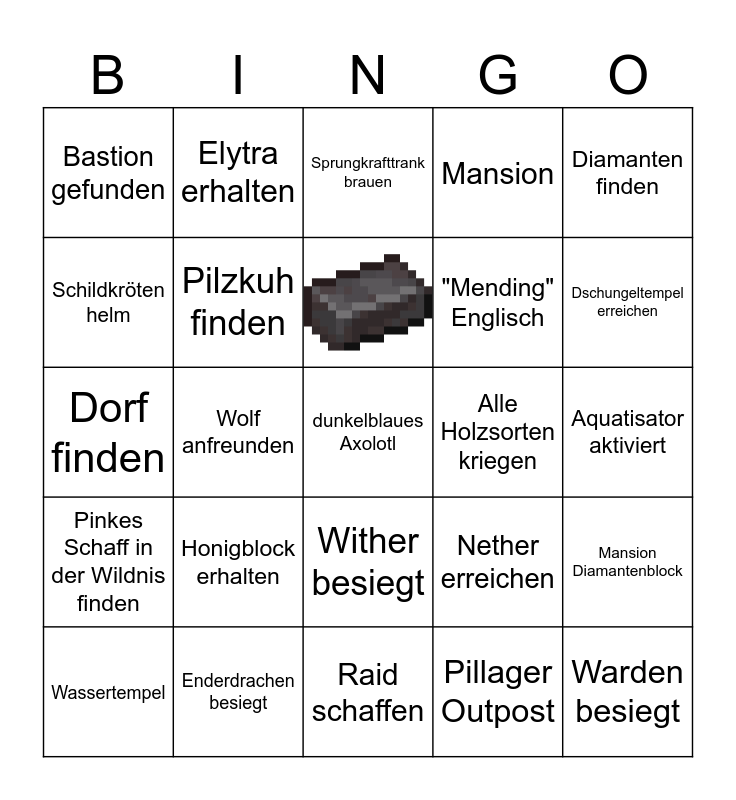 This bingo card has 1 images and 24 words: Honigblock erhalten, Raid schaffen, Wassertempel, Diamanten finden, Bastion gefunden, Schildkröten helm, Elytra erhalten, Alle Holzsorten kriegen, Wither besiegt, "Mending" Englisch, Dorf finden, Nether erreichen, Mansion Diamantenblock, Pilzkuh finden, Warden besiegt, Aquatisator aktiviert, Sprungkrafttrank brauen, Dschungeltempel erreichen, Wolf anfreunden, dunkelblaues Axolotl, Enderdrachen besiegt, Pinkes Schaff in der Wildnis finden, Mansion and Pillager Outpost.