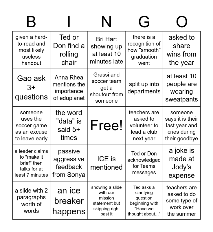 This bingo card has a free space and 24 words: passive aggressive feedback from Sonya, an ice breaker happens, Grassi and soccer team get a shoutout from someone, a slide with 2 paragraphs worth of words, asked to share wins from the year, given a hard-to-read and most likely useless handout, Gao ask 3+ questions, Ted or Don find a rolling chair, teachers are asked to volunteer to lead a club next year, ICE is mentioned, split up into departments, someone uses the soccer game as an excuse to leave early, Ted or Don acknowledged for Teams messages, a joke is made at Jody's expense, Anna Rhea mentions the importance of eduplanet, Ted asks a clarifying question beginning with "Have we thought about...", someone says it is their last year and cries during their goodbye, Bri Hart showing up at least 10 minutes late, at least 10 people are wearing sweatpants, the word "data" is said 5+ times, teachers are asked to do some type of work over the summer, a leader claims to "make it brief" then talks for at least 7 minutes, there is a recognition of how "smooth" graduation went and showing a slide with our mission statement but skipping right past it.