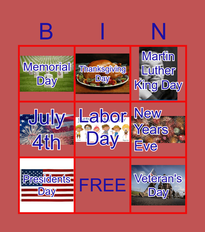 This bingo card has 7 images, a free space and 8 words: New Years Eve, Martin Luther King Day, Thanksgiving Day, Presidents Day, Memorial Day, Veteran's Day, July 4th and FREE.