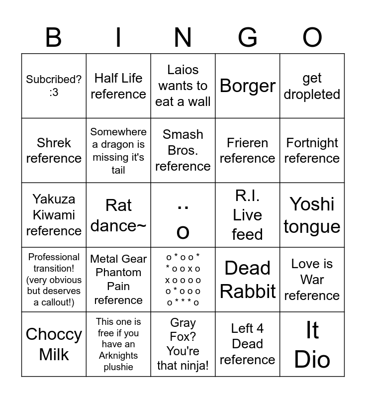 This bingo card has 25 words: Metal Gear Phantom Pain reference, Gray Fox? You're that ninja!, Smash Bros. reference, Choccy Milk, get dropleted, Subcribed? :3, Shrek reference, Half Life reference, R.I. Live feed, o * o o * * o o x o x o o o o o * o o o o * * * o, Frieren reference, Yakuza Kiwami reference, Dead Rabbit, Love is War reference, Somewhere a dragon is missing it's tail, It Dio, Yoshi tongue, Laios wants to eat a wall, Fortnight reference, Rat dance~, .. o, This one is free if you have an Arknights plushie, Professional transition! (very obvious but deserves a callout!), Borger and Left 4 Dead reference.