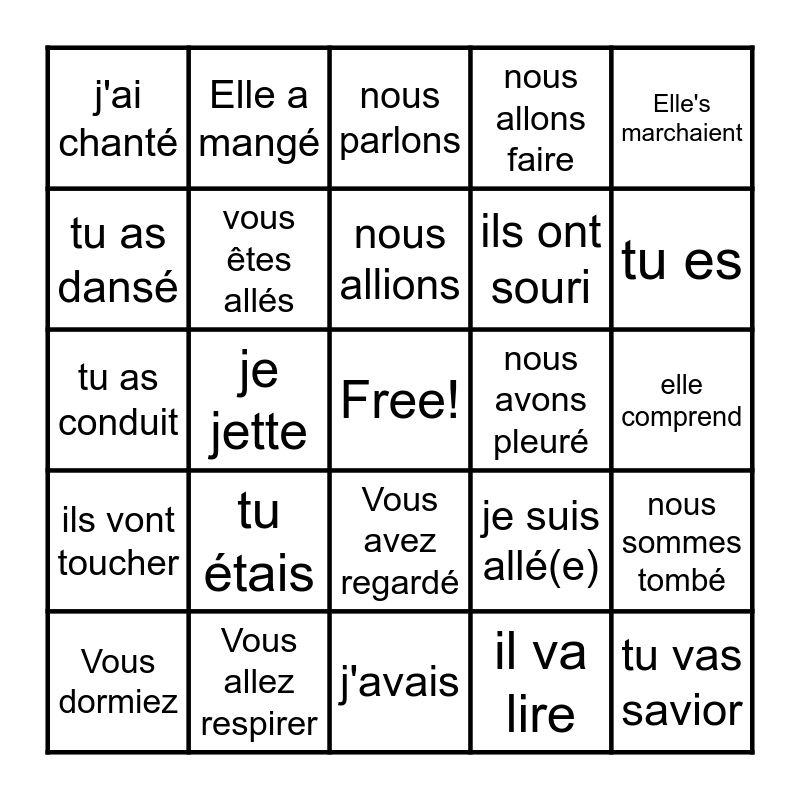 This bingo card has a free space and 25 words: tu étais, j'avais, nous allions, Vous dormiez, Elle's marchaient, j'ai chanté, tu as dansé, Elle a mangé, nous avons pleuré, Vous avez regardé, ils ont souri, tu as conduit, je suis allé(e), nous sommes tombé, vous êtes allés, elles lisent, elle comprend, nous parlons, tu es, je jette, tu vas savior, Vous allez respirer, ils vont toucher, nous allons faire and il va lire.