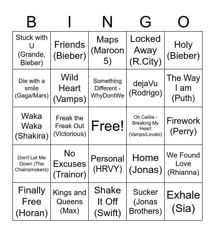 This bingo card has a free space and 299 words: Fortnight (feat. Post Malone), My Boy Only Breaks His Favorite Toys (Swift), Die with a smile (Gaga/Mars), Azizam (Sheeran), Espresso (Carpenter), Warm (Grande), Birds of a Feather (Eilish), Please, Please, Please (Carpenter), Close to you (Abrams), We Cant be Friends (Grande), Beautiful Things (Boone), As It Was (Styles), Unwritten (Bedingfield), Belong Together (Ambor), These Words (Badger, Bedingfield), Flowers (Cyrus), Now that We don't Talk (Swift), All You Had To Do Was Stay (Swift), I Aint Worried (OneRepublic), Midnight Rain (Swift), Single Soon (Gomez), dejaVu (Rodrigo), Message in a Bottle (Swift), Shivers (Swift), Break my Heart (Lipa), Hold On (Bieber), How you Get the Girl (Swift), Shake It Off (Swift), New Romantics (Swift), Love Story (Swift), Adore You (Styles), Sunday Best (Surfaces), Sucker (Jonas Brothers), Olivia (One Direction), Bad Guy (Eilish, Beiber), Lovely (Eilish/Khalid), Ocean Eyes (Eilish), Rain on me (Grande, Gaga), I Don't Care (Bieber/Sheeran), Eastside (Blanco, Halsey, Khalid), Drag me Down (OneDirection), Steal My Girl (One Direction), Riptide (Joy), Boom Clap (Charlie XCX), Summer (Harris), Somebody To You (Vamps), Oh Celilia -Breaking My Heart (Vamps/Lovato), Oh Cecilia (Menedes/Vamps), Symphony (Bandit, Larsson), Let me Go (Steinfeld, Alesso, Florida), Me! (Swift, Urie), Rewrite the Stars (Efron, Zendaya), Don't Start Now (Lipa), How Far I'll Go (Moana-Disney), Brand New (Rector), Me Too (Trainor), No (Trainor), No Excuses (Trainor), The Greatest (Lamar), Galway Girl (Sheeran), Bibia Be Ye Ye (Sheeran), Something in That I Want (Potter), Better When Im Dancin (Trainor), Cake by the Ocean (DNCE), Happier (Marshmello, Bastille), Teeth (5 Seconds of Summer), Try Everything (Shakira), I'm a Believer (Smashmouth), Roar (Perry), This is what you came for (Harris, Rhianna), Only Human (Jonas Brothers), We Don't Talk Anymore (Puth, Gomez), Attention (Puth), How Long (Puth), Nice to Meet Ya (Horan), Love Myself (Steinfeld), Dancing in the Dark (Rhianna), Counting Stars (One Republic), Clarity (Zedd, Foxes), Intentions (Beiber, Quavo), Personal (HRVY), Beautiful People (Sheeran), A Whole New World (Zayn), If I Can't Have You (Mendes), Maps (Maroon 5), Ugly Heart (GRL), Electric Love (Borns), Someone To You (Banners), Something Just Like This (Chainsmokers, Coldplay), Stay (Zedd), The Way I am (Puth), Wait (Maroon 5), Just Like Fire (Pink), Bright (Echosmith), Heartbeat Song (Clarkson), BellyAche (Eilish), 10,000 Hours (Beiber), Take it Easy (Surfaces), Let Me Love You (Bieber), What Do You Mean (Bieber), What Do I Know (Sheeran), Never Forget you (Larsson), Perfect (Sheeran), Friends (Marshmello), Meant to Be (Rexha), Castle on the Hill (Sheeran), The Greatest Show (Greatest Showman), Come Alive (Greatest Showman), This is Me (Greatest Showman), A Million Dreams (Greatest Showman), Waka Waka (Shakira), Colors (Derulo), Lush Life (Larsson ), History (Holt), Stuck with U (Grande, Bieber), 2002(Anne Marie), The Middle (Zedd), Back To You (Gomez), Fight Song (Platten), Cheap Thrills (Sia), Locked Away (R.City), No Money (Galantis), We Found Love (Rhianna), Don't Let Me Down (The Chainsmokers), London Boy (Swift), Rockabye (Bandit), New Rules (Lipa), Can't Stop the Feeling (Timberlake), Kings and Queens (Max), I Love Me (Lovato), Pompeii (Bastille), Firework (Perry), Fireflies (Owl City), Fire and the Flood (Joy), Wake Me Up (Avicii), The Nights (Avicii), Paper Rings (Swift), Gorgeous (Swift), Best Song Ever (One Direction), One Thing (One Direction), Live While We're Young, Up All Night (One Direction), Act My Age (One Direction), Together (Sia), All I Want (Rodrigo), Sunflower- Malone, Dont Go Breaking My Heart (Elton John), Call You Mine (Chainsmokers), Home (Phillip), The Bones (Hozier), Say Hey (Granti), Be Kind (Halsey), Speechless (Dan +Shay), Slow Dance (Mitchell), Breakthrough (Hicks), No Promises (Lovato), Had Me @ Hello (Holt), Don't Give Up on Me (Grammer), Something Big (Mendes), Upside Down (Johnson), Hurricane (Vamps), From Now On (Zac Brown), So Am I (Max), Breaking Free (High School Musical), Work This Out (High School Musical), All For One (HSM), On Top of the World (Imagine Dragons), They Don't Know (Grande), Came Here for Love) Eye, Classic MKTO, Cups (Kendrick), Faith (Wonder), Havana (Cabello), Can't Stop Dancin (Becky G), What Lovers Do (Maroon 5), Party In The USA (Cyrus), Wolves (Gomez), Friends (Bieber), Golden (Styles), Good Old Days (Macklemore), Summer Feelings (Stella), On Me (Rhett), Perfect Strangers (Blue), One Last Time (Grande), Problem (Grande), Lights (Goulding), Saturday Sun (Joy), Fine By Me (Grammer), Rather Be (Bandit), One Foot (Walk the Moon), Reflections (MisterWives), This is Me (Ke$ha), Hurricane (Mendler), Flashlight (Steinfeld), Broken Glass (Platten), Something Wild (Stirling), Dance With Me Tonight (Murs), This Town (Horan), Sing It With Me (Cooper), Conversations in the Dark (Legend), Someone You Loved (Capaldi), No New Friends (Sia), Year 3000 (Jonas Brothers), Burning Up (Jonas Brothers), Play My Music (Jonas Brothers), Geronimo (Sheppard), Nver Really Over (Perry), Animal (Neon Trees), Wavin' Flag (K'Naan, Introducing Me (Jonas Brothers), Send My Love (Adele), I want Crazy (Hayes), Budapest (Ezra), You'll Always Find your Way (Cyrus), Beauty and The Beast (Grande), Rise (Blue), In the Name of Love Garriz), Black Magic (Little Mix), What a Man Gotta Do (Jonas Brothers), September (Timberlake), Think before I talk (Astrid), Youth (Mendes), Dancing Queen (Streep), Something Different - WhyDontWe, Wild Heart (Vamps), Beggin' ON your Knees (Victorious Cast), Freak the Freak Out (Victorious), He Could Be the One (Cyrus), If We Were a Movie (Cyrus), Ready or Not (Mendler), Nothing Breaks like a heart (Rondon), Dance Monkey (Tones and I), Sweet but Psycho (Max), Lia (Cabello), Torn (Max), Young Blood (5 Seconds of Summer), What About Us (PINK), What Makes you Beautiful (One