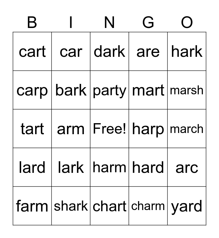 This bingo card has a free space and 29 words: farm, card, arm, part, cart, dark, bark, lark, harp, shark, march, yard, chart, charm, marsh, harsh, harm, lard, hark, tart, hard, large, mart, carp, are, car, arc, party and ajar.