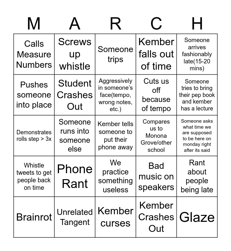 This bingo card has a free space and 24 words: Phone Rant, Unrelated Tangent, Aggressively in someone’s face(tempo, wrong notes, etc.), Brainrot, Someone arrives fashionably late(15-20 mins), Calls Measure Numbers, Pushes someone into place, Screws up whistle, Compares us to Monona Grove/other school, We practice something useless, Cuts us off because of tempo, Demonstrates rolls step > 3x, Bad music on speakers, Rant about people being late, Student Crashes Out, Kember Crashes Out, Someone asks what time we are supposed to be here on monday right after its said, Someone trips, Someone tries to bring their pep book and kember has a lecture, Someone runs into someone else, Glaze, Whistle tweets to get people back on time, Kember falls out of time and Kember curses.