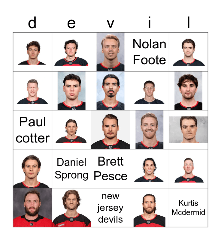 This bingo card has 19 images and 6 words: new jersey devils, Paul cotter, Daniel Sprong, Brett Pesce, Nolan Foote and Kurtis Mcdermid.
