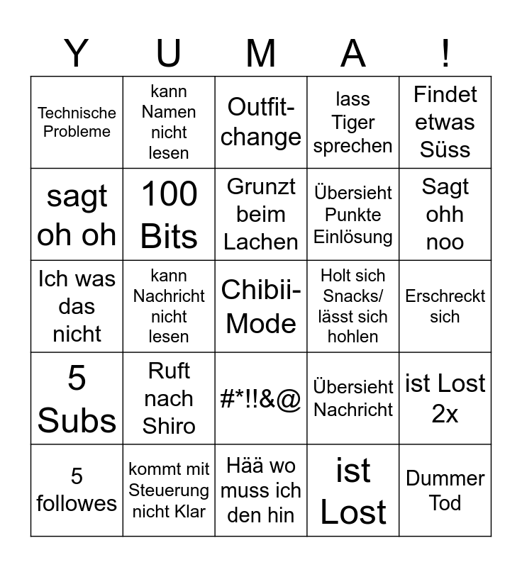 This bingo card has a free space and 24 words: Ruft nach Shiro, kommt mit Steuerung nicht Klar, Grunzt beim Lachen, 5 followes, Findet etwas Süss, Technische Probleme, sagt oh oh, kann Namen nicht lesen, Holt sich Snacks/ lässt sich hohlen, #*!!&@, Übersieht Punkte Einlösung, Ich was das nicht, Übersieht Nachricht, ist Lost 2x, 100 Bits, ist Lost, Erschreckt sich, Outfit-change, Sagt ohh noo, kann Nachricht nicht lesen, Dummer Tod, 5 Subs, lass Tiger sprechen and Hää wo muss ich den hin.