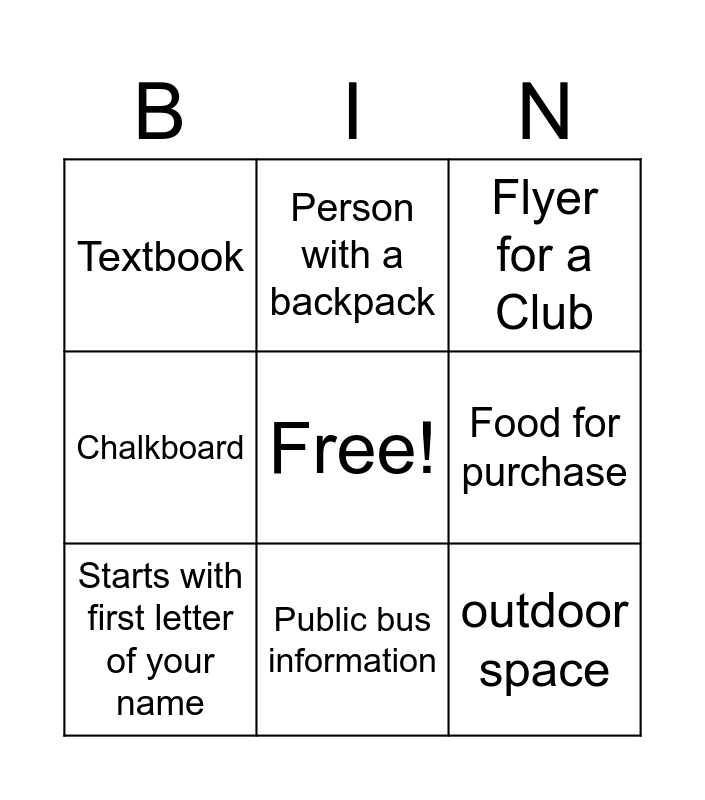 This bingo card has a free space and 8 words: Food for purchase, Flyer for a Club, Person with a backpack, Starts with first letter of your name, Textbook, outdoor space, Chalkboard and Public bus information.