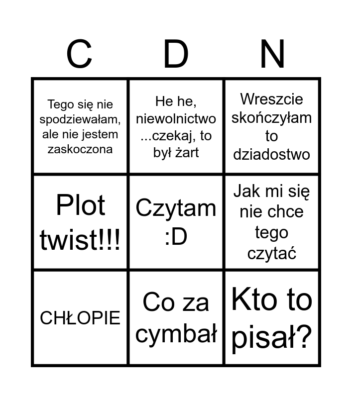 This bingo card has a free space and 11 words: Kto to tłumaczył?, Co za cymbał, Kto to pisał?, CHŁOPIE, He he, niewolnictwo ...czekaj, to był żart, Wreszcie skończyłam to dziadostwo, Jak mi się nie chce tego czytać, Didn't see THAT comin', Plot twist!!!, Tego się nie spodziewałam, ale nie jestem zaskoczona and Dobrze mu/jej tak.