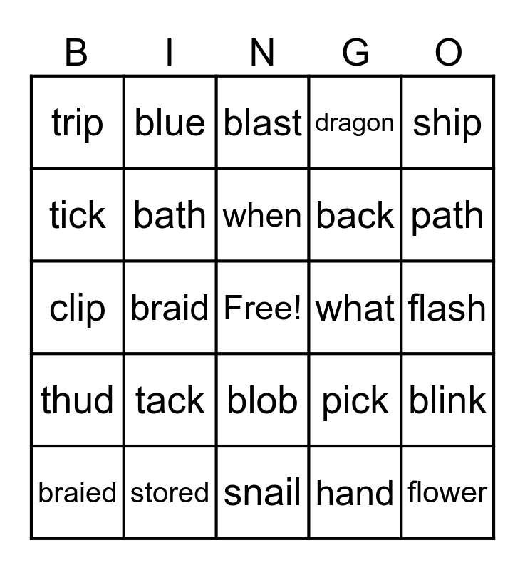 This bingo card has a free space and 24 words: tack, stored, when, braied, ship, trip, tick, blue, what, blob, back, clip, pick, blink, bath, hand, flash, blast, path, braid, flower, thud, dragon and snail.