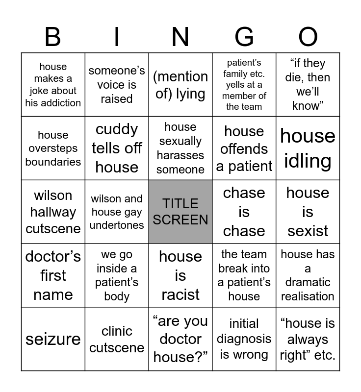 This bingo card has a free space and 24 words: we go inside a patient’s body, clinic cutscene, house sexually harasses someone, seizure, “if they die, then we’ll know”, house makes a joke about his addiction, house oversteps boundaries, someone’s voice is raised, chase is chase, house is racist, house offends a patient, wilson hallway cutscene, the team break into a patient’s house, house has a dramatic realisation, cuddy tells off house, initial diagnosis is wrong, house is sexist, (mention of) lying, house idling, wilson and house gay undertones, “house is always right” etc., doctor’s first name, patient’s family etc. yells at a member of the team and “are you doctor house?”.
