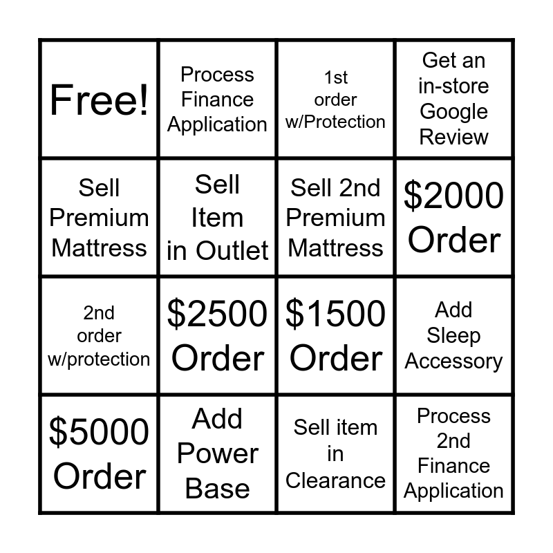 This bingo card has 16 words: $5000 Order, Add Power Base, 1st order w/Protection, Get an in-store Google Review, Sell Premium Mattress, Process Finance Application, $1500 Order, Add Sleep Accessory, Free!, Sell Item in Outlet, Sell item in Clearance, $2000 Order, 2nd order w/protection, $2500 Order, Sell 2nd Premium Mattress and Process 2nd Finance Application.