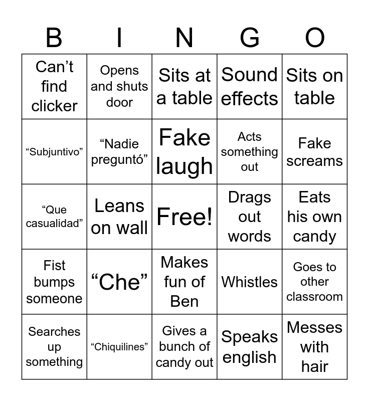 This bingo card has a free space and 24 words: “Che”, “Chiquilines”, Fake laugh, Searches up something, Sits on table, Can’t find clicker, “Subjuntivo”, Opens and shuts door, Drags out words, Makes fun of Ben, Acts something out, “Que casualidad”, Whistles, Goes to other classroom, “Nadie preguntó”, Speaks english, Eats his own candy, Sits at a table, Fake screams, Leans on wall, Messes with hair, Fist bumps someone, Sound effects and Gives a bunch of candy out.