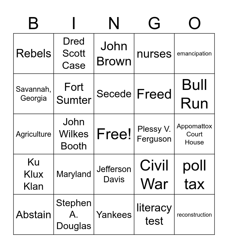This bingo card has a free space and 24 words: Maryland, Stephen A. Douglas, Secede, Abstain, emancipation, Rebels, Savannah, Georgia, Dred Scott Case, Plessy V. Ferguson, Jefferson Davis, Freed, Agriculture, Civil War, poll tax, Fort Sumter, literacy test, Appomattox Court House, John Brown, Bull Run, John Wilkes Booth, reconstruction, Ku Klux Klan, nurses and Yankees.