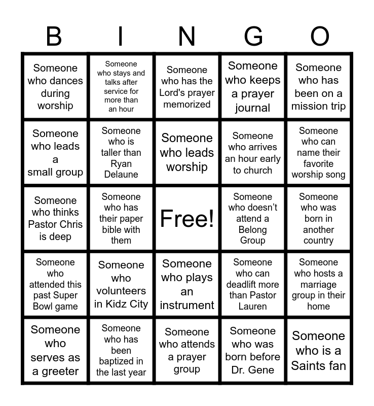 This bingo card has a free space and 24 words: Someone who volunteers in Kidz City, Someone who has been baptized in the last year, Someone who leads worship, Someone who serves as a greeter, Someone who has been on a mission trip, Someone who dances during worship, Someone who leads a small group, Someone who stays and talks after service for more than an hour, Someone who doesn’t attend a Belong Group, Someone who plays an instrument, Someone who arrives an hour early to church, Someone who thinks Pastor Chris is deep, Someone who can deadlift more than Pastor Lauren, Someone who hosts a marriage group in their home, Someone who is taller than Ryan Delaune, Someone who was born before Dr. Gene, Someone who was born in another country, Someone who has the Lord's prayer memorized, Someone who can name their favorite worship song, Someone who has their paper bible with them, Someone who is a Saints fan, Someone who attended this past Super Bowl game, Someone who keeps a prayer journal and Someone who attends a prayer group.