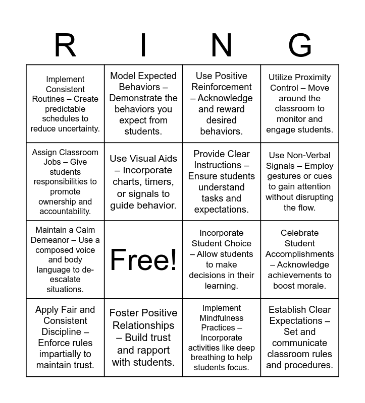 This bingo card has 18 words: Free!, Establish Clear Expectations – Set and communicate classroom rules and procedures., Use Positive Reinforcement – Acknowledge and reward desired behaviors., Implement Consistent Routines – Create predictable schedules to reduce uncertainty., Incorporate Student Choice – Allow students to make decisions in their learning., Utilize Proximity Control – Move around the classroom to monitor and engage students., Apply Fair and Consistent Discipline – Enforce rules impartially to maintain trust., Model Expected Behaviors – Demonstrate the behaviors you expect from students., Use Non-Verbal Signals – Employ gestures or cues to gain attention without disrupting the flow., Maintain a Calm Demeanor – Use a composed voice and body language to de-escalate situations., Implement Mindfulness Practices – Incorporate activities like deep breathing to help students focus., Assign Classroom Jobs – Give students responsibilities to promote ownership and accountability., Celebrate Student Accomplishments – Acknowledge achievements to boost morale., Use Visual Aids – Incorporate charts, timers, or signals to guide behavior., Provide Clear Instructions – Ensure students understand tasks and expectations., Encourage Peer Teaching – Allow students to explain concepts to each other., Foster Positive Relationships – Build trust and rapport with students. and Teacher Strategies.