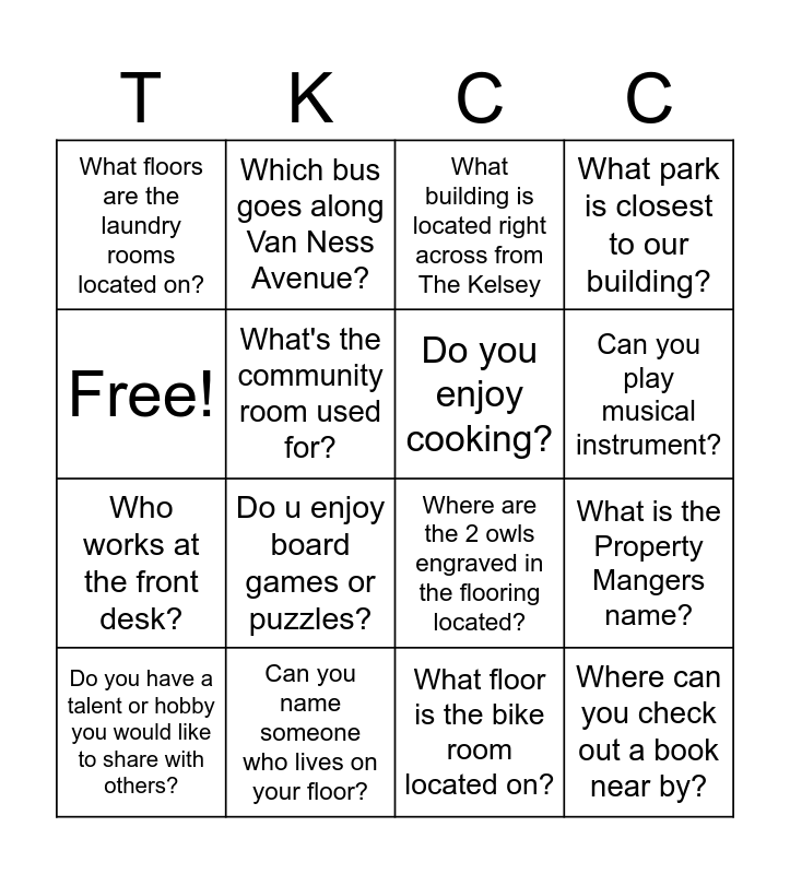 This bingo card has 16 words: Can you name someone who lives on your floor?, What is the Property Mangers name?, What building is located right across from The Kelsey, What floors are the laundry rooms located on?, Who works at the front desk?, Which bus goes along Van Ness Avenue?, Where are the 2 owls engraved in the flooring located?, What floor is the bike room located on?, Free!, What's the community room used for?, Do you have a talent or hobby you would like to share with others?, What park is closest to our building?, Do u enjoy board games or puzzles?, Can you play musical instrument?, Do you enjoy cooking? and Where can you check out a book near by?.