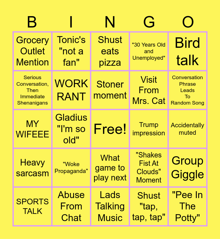 This bingo card has a free space and 32 words: Shust "tap, tap, tap", Rob rants about random fact, Gladius "I'm so old", Tokin' Tonic, Heavy sarcasm, WORK RANT, Bird talk, Group Giggle, Tonic's "not a fan", Booted from game, Stoner moment, Shust eats pizza, Vegetable mention, Garden talk, Trump impression, Weather Chatter, SPORTS TALK, MY WIFEEE, What game to play next, "Woke Propaganda", "Shakes Fist At Clouds" Moment, Exercise Routine, Accidentally muted, Abuse From Chat, "Pee In The Potty", "30 Years Old and Unemployed", Visit From Mrs. Cat, Serious Conversation, Then Immediate Shenanigans, Grocery Outlet Mention, Lads Talking Music, Foodies Talk Food and Conversation Phrase Leads To Random Song.
