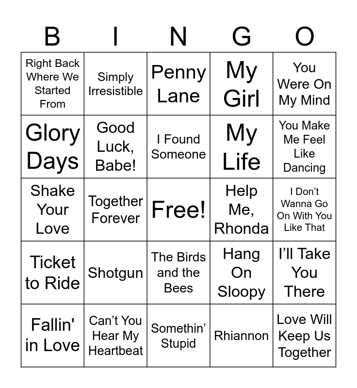 This bingo card has a free space and 43 words: Shining Star, Love Will Keep Us Together, Magic, Fallin' in Love, It Only Takes a Minute, Rhiannon, Penny Lane, Wooly Bully, You Were On My Mind, Can’t You Hear My Heartbeat, My Girl, Help Me, Rhonda, The Birds and the Bees, Shotgun, I Got You Babe, Somethin’ Stupid, Stop! In the Name of Love, Shake Your Love, Naughty Girls (Need Love Too), You Make Me Feel Like Dancing, Simply Irresistible, Wild Wild West, Shattered Dreams, Right Back Where We Started From, A Hazy Shade of Winter, I Don’t Wanna Go On With You Like That, Silhouettes, What’s New Pussycat?, Hang On Sloopy, Ticket to Ride, I Know a Place, I’ll Take You There, Need You Tonight, Together Forever, Dirty Diana, New Sensation, Nothin’ But A Good Time, I Found Someone, Glory Days, My Life, I Hope, Good Luck, Babe! and Just Like Paradise.