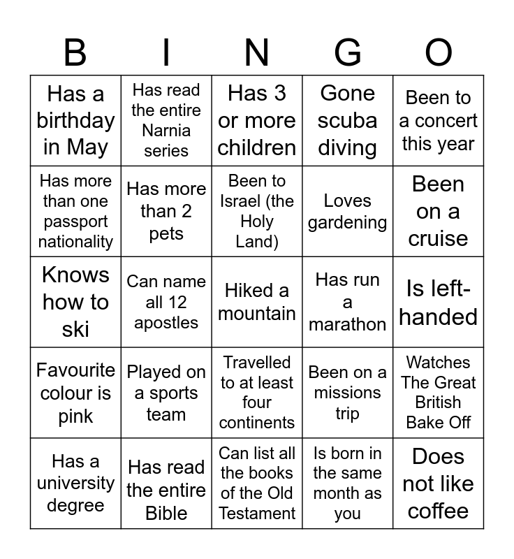 This bingo card has 30 words: Has read the entire Bible, Can play the violin, Can name all 12 apostles, Speaks more than one language fluently, Has a birthday in May, Has 3 or more children, Has more than 2 pets, Travelled to at least four continents, Has run a marathon, Can list all the books of the Old Testament, Is left-handed, Hiked a mountain, Is born in the same month as you, Does not like coffee, Been on a cruise, Seen the northern lights, Been on a missions trip, Favourite colour is pink, Played on a sports team, Been to a concert this year, Knows how to ski, Can knit or crochet, Has read the entire Narnia series, Loves gardening, Has more than one passport nationality, Gone scuba diving, Watches The Great British Bake Off, Has a university degree, Been to Israel (the Holy Land) and Loves to paint.
