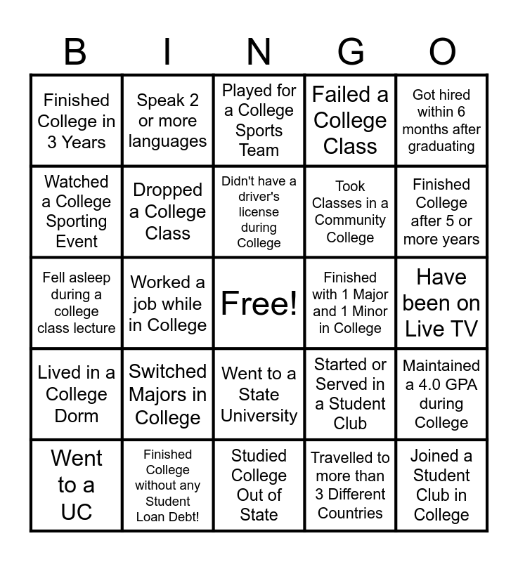 This bingo card has a free space and 24 words: Switched Majors in College, Finished College without any Student Loan Debt!, Didn't have a driver's license during College, Went to a UC, Got hired within 6 months after graduating, Finished College in 3 Years, Watched a College Sporting Event, Speak 2 or more languages, Finished with 1 Major and 1 Minor in College, Went to a State University, Took Classes in a Community College, Fell asleep during a college class lecture, Started or Served in a Student Club, Maintained a 4.0 GPA during College, Dropped a College Class, Travelled to more than 3 Different Countries, Have been on Live TV, Played for a College Sports Team, Finished College after 5 or more years, Worked a job while in College, Joined a Student Club in College, Lived in a College Dorm, Failed a College Class and Studied College Out of State.