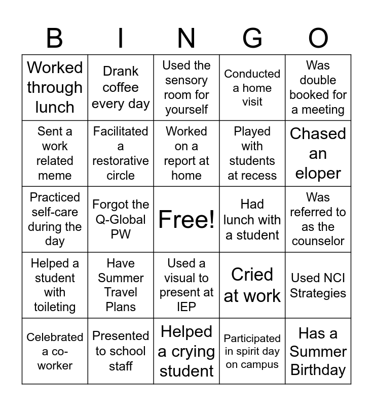 This bingo card has a free space and 24 words: Have Summer Travel Plans, Presented to school staff, Worked on a report at home, Celebrated a co-worker, Was double booked for a meeting, Worked through lunch, Sent a work related meme, Drank coffee every day, Had lunch with a student, Used a visual to present at IEP, Played with students at recess, Practiced self-care during the day, Cried at work, Used NCI Strategies, Facilitated a restorative circle, Participated in spirit day on campus, Was referred to as the counselor, Used the sensory room for yourself, Chased an eloper, Forgot the Q-Global PW, Has a Summer Birthday, Helped a student with toileting, Conducted a home visit and Helped a crying student.