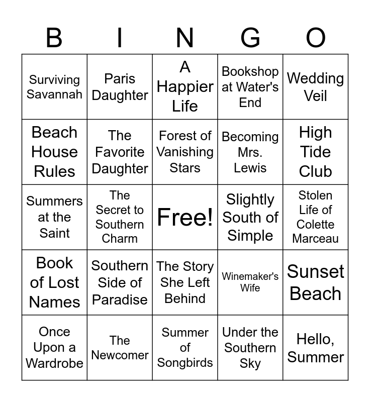 This bingo card has a free space and 24 words: Southern Side of Paradise, The Newcomer, Forest of Vanishing Stars, Once Upon a Wardrobe, Wedding Veil, Surviving Savannah, Beach House Rules, Paris Daughter, Slightly South of Simple, The Story She Left Behind, Becoming Mrs. Lewis, Summers at the Saint, Winemaker's Wife, Sunset Beach, The Favorite Daughter, Under the Southern Sky, Stolen Life of Colette Marceau, A Happier Life, High Tide Club, The Secret to Southern Charm, Hello, Summer, Book of Lost Names, Bookshop at Water's End and Summer of Songbirds.