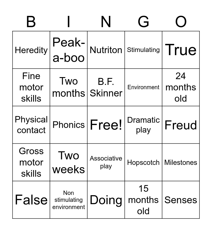 This bingo card has a free space and 24 words: Two weeks, Non stimulating environment, B.F. Skinner, False, True, Heredity, Fine motor skills, Peak-a-boo, Dramatic play, Associative play, Environment, Physical contact, Hopscotch, Milestones, Two months, 15 months old, Freud, Nutriton, 24 months old, Phonics, Senses, Gross motor skills, Stimulating and Doing.