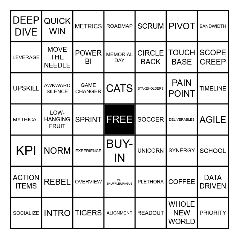 This bingo card has a free space and 48 words: PLETHORA, TOUCH BASE, ALIGNMENT, LOW-HANGING FRUIT, GAME CHANGER, AGILE, QUICK WIN, INTRO, PIVOT, BUY-IN, BANDWIDTH, ROADMAP, PAIN POINT, STAKEHOLDERS, ACTION ITEMS, DELIVERABLES, LEVERAGE, SCOPE CREEP, COFFEE, SCRUM, CIRCLE BACK, SPRINT, DEEP DIVE, MOVE THE NEEDLE, DATA DRIVEN, POWER BI, TIMELINE, SOCIALIZE, CATS, AWKWARD SILENCE, WHOLE NEW WORLD, SOCCER, SCHOOL, REBEL, MYTHICAL, UNICORN, SYNERGY, UPSKILL, EXPERIENCE, OVERVIEW, KPI, PRIORITY, METRICS, TIGERS, MEMORIAL DAY, MR. SNUFFLEUPAGUS, NORM and READOUT.