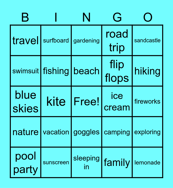 This bingo card has a free space and 24 words: vacation, sunscreen, beach, pool party, sandcastle, travel, swimsuit, surfboard, ice cream, goggles, flip flops, blue skies, camping, exploring, fishing, family, fireworks, gardening, hiking, kite, lemonade, nature, road trip and sleeping in.
