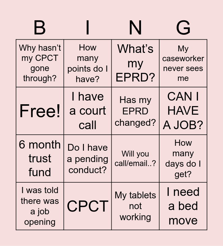 This bingo card has 16 words: CPCT, How many days do I get?, What’s my EPRD?, Why hasn’t my CPCT gone through?, 6 month trust fund, How many points do I have?, Will you call/email..?, My tablets not working, Free!, I have a court call, I was told there was a job opening, My caseworker never sees me, Do I have a pending conduct?, CAN I HAVE A JOB?, Has my EPRD changed? and I need a bed move.