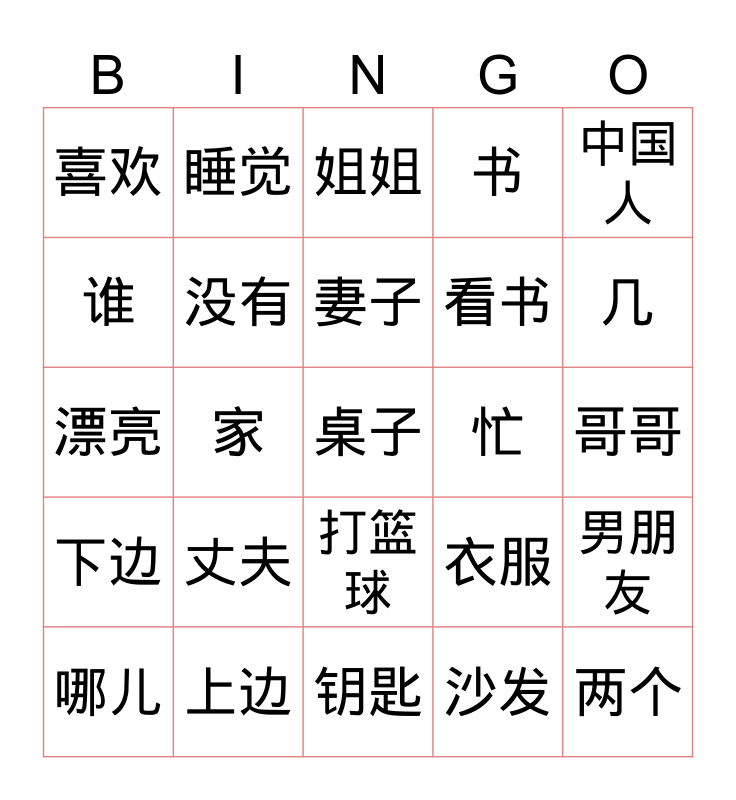 This bingo card has 25 words: 丈夫, 钥匙, 妻子, 哪儿, 中国人, 喜欢, 谁, 睡觉, 忙, 打篮球, 看书, 漂亮, 衣服, 男朋友, 没有, 两个, 哥哥, 姐姐, 几, 家, 桌子, 上边, 下边, 书 and 沙发.