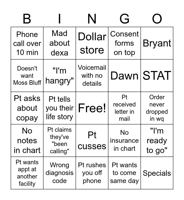 This bingo card has a free space and 24 words: Pt claims they've "been calling", Wrong diagnosis code, Voicemail with no details, Pt wants appt at another facility, Bryant, Phone call over 10 min, Doesn't want Moss Bluff, Mad about dexa, Pt received letter in mail, Pt cusses, Dawn, Pt asks about copay, No insurance in chart, "I'm ready to go", "I'm hangry", Pt wants to come same day, Order never dropped in wq, Dollar store, STAT, Pt tells you their life story, Specials, No notes in chart, Consent forms on top and Pt rushes you off phone.