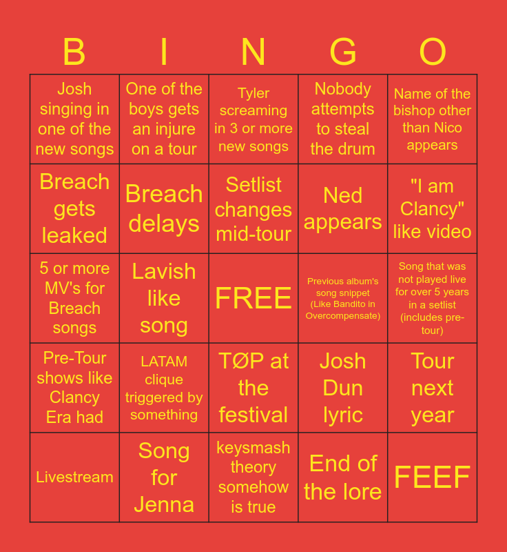 This bingo card has a free space and 24 words: LATAM clique triggered by something, Song for Jenna, Setlist changes mid-tour, Livestream, Name of the bishop other than Nico appears, Josh singing in one of the new songs, Breach gets leaked, One of the boys gets an injure on a tour, Previous album's song snippet (Like Bandito in Overcompensate), TØP at the festival, Ned appears, 5 or more MV's for Breach songs, Josh Dun lyric, Tour next year, Breach delays, End of the lore, Song that was not played live for over 5 years in a setlist (includes pre-tour), Tyler screaming in 3 or more new songs, "I am Clancy" like video, Lavish like song, FEEF, Pre-Tour shows like Clancy Era had, Nobody attempts to steal the drum and keysmash theory somehow is true.