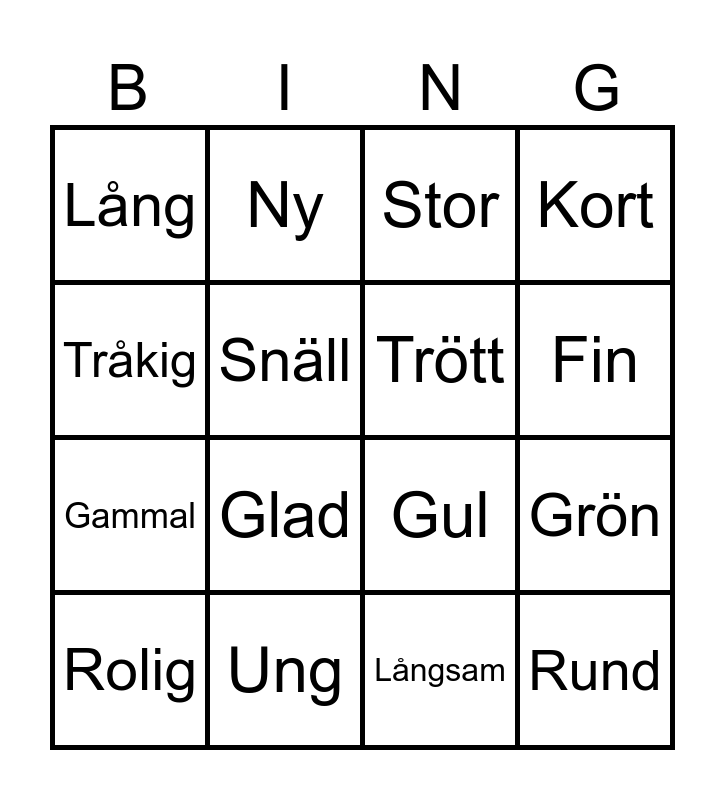 This bingo card has 21 words: Ung, Trevlig, Ny, Stark, Långsam, Trött, Lång, Stor, Gul, Fin, Gammal, Kort, Rund, Gullig, Snäll, Blå, Rolig, Glad, Tråkig, Grön and Liten.