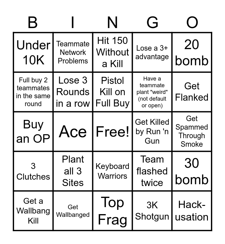 This bingo card has a free space and 32 words: 3K Shotgun, Kill with each category of gun, Ace, Knife, 3 Clutches, Lose 3 Rounds in a row, 20 bomb, 30 bomb, Teammate Network Problems, Defuse with Enemies Alive, Pistol Kill on Full Buy, Hit 150 Without a Kill, More Elimination than Spike/Defuse Win (1 Half), Get a Kill by Run 'n Gun, Get Killed by Run 'n Gun, BAD call, Get a Wallbang Kill, Buy an OP, Keyboard Warriors, Plant all 3 Sites, Team flashed twice, 3 First Bloods, Get Spammed Through Smoke, Get Wallbanged, Hack-usation, Lose a 3+ advantage, Have a teammate plant "weird" (not default or open), Full buy 2 teammates in the same round, Under 10K, Top Frag, MVP Stolen and Get Flanked.