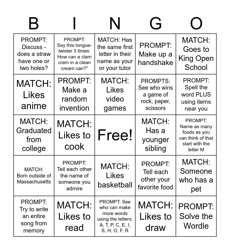This bingo card has a free space and 24 words: PROMPT: Tell each other the name of someone you admire, MATCH: Likes to read, MATCH: Likes video games, PROMPT: Try to write an entire song from memory, MATCH: Goes to King Open School, PROMPT: Discuss - does a straw have one or two holes?, MATCH: Likes anime, PROMPT: Say this tongue-twister 3 times: How can a clam cram in a clean cream can?", MATCH: Has a younger sibling, MATCH: Likes basketball, PROMPTS: See who wins a game of rock, paper, scissors, MATCH: Graduated from college, PROMPT: Tell each other your favorite food, MATCH: Someone who has a pet, PROMPT: Make a random invention, MATCH: Likes to draw, PROMPT: Name as many foods as you can think of that start with the letter M, MATCH: Has the same first letter in their name as your or your tutor, PROMPT: Spell the word PLUS using items near you, MATCH: Likes to cook, PROMPT: Solve the Wordle, MATCH: Born outside of Massachusetts, PROMPT: Make up a handshake and PROMPT: See who can make more words using the letters: A, T, P, C, E, I, S, H, O, F, R.