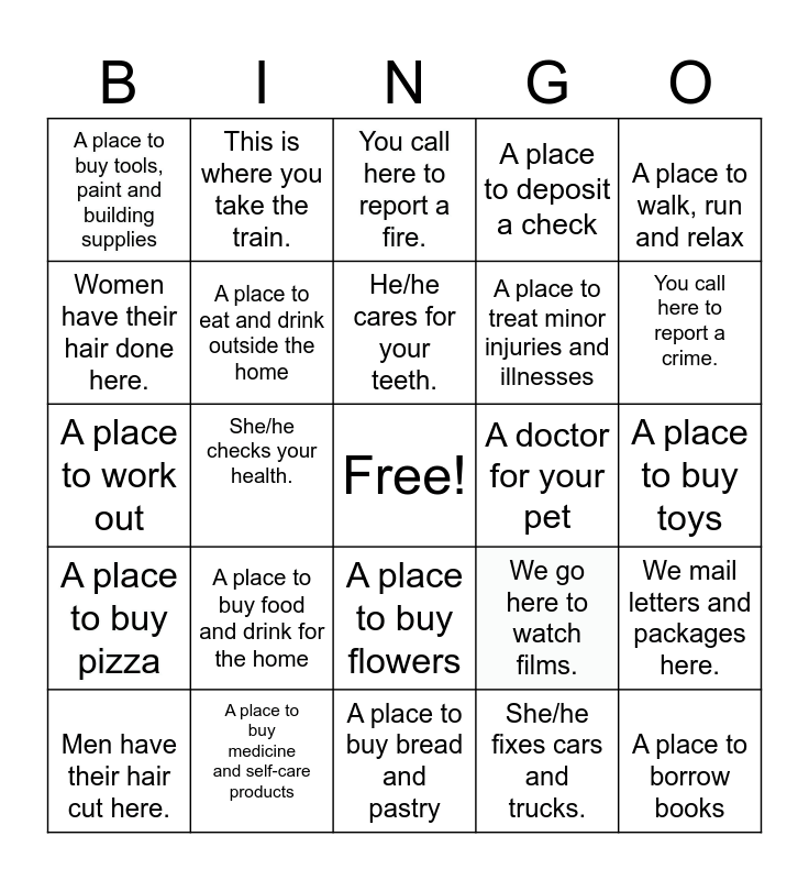 This bingo card has a free space and 24 words: A place to buy food and drink for the home, A place to buy medicine and self-care products, He/he cares for your teeth., Men have their hair cut here., A place to walk, run and relax, A place to buy tools, paint and building supplies, Women have their hair done here., This is where you take the train., A doctor for your pet, A place to buy flowers, A place to treat minor injuries and illnesses, A place to work out, We go here to watch films., We mail letters and packages here., A place to eat and drink outside the home, She/he fixes cars and trucks., A place to buy toys, You call here to report a fire., You call here to report a crime., She/he checks your health., A place to borrow books, A place to buy pizza, A place to deposit a check and A place to buy bread and pastry.
