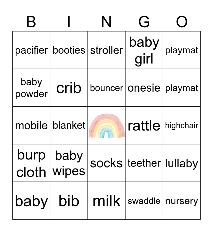 This bingo card has a free space and 29 words: baby, diaper, blanket, bottle, pacifier, stroller, crib, baby wipes, rattle, bib, highchair, nursery, milk, swaddle, playmat, toys, socks, burp cloth, playmat, mobile, teether, bassinet, onesie, baby powder, baby girl, booties, lullaby, bouncer and teddy bear.