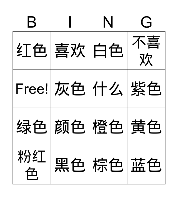 This bingo card has 16 words: 黑色, 黄色, 白色, 红色, 绿色, 喜欢, 橙色, 棕色, Free!, 灰色, 粉红色, 不喜欢, 颜色, 紫色, 什么 and 蓝色.