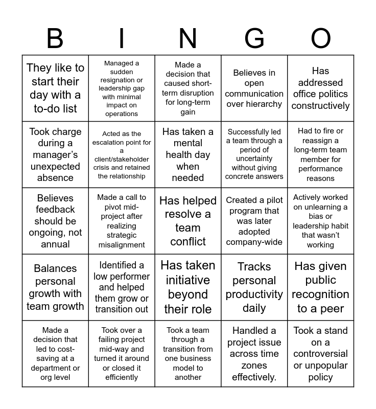 This bingo card has a free space and 24 words: Identified a low performer and helped them grow or transition out, Took over a failing project mid-way and turned it around or closed it efficiently, Has taken a mental health day when needed, Made a decision that led to cost-saving at a department or org level, Has addressed office politics constructively, They like to start their day with a to-do list, Took charge during a manager’s unexpected absence, Managed a sudden resignation or leadership gap with minimal impact on operations, Created a pilot program that was later adopted company-wide, Has taken initiative beyond their role, Successfully led a team through a period of uncertainty without giving concrete answers, Believes feedback should be ongoing, not annual, Tracks personal productivity daily, Has given public recognition to a peer, Acted as the escalation point for a client/stakeholder crisis and retained the relationship, Handled a project issue across time zones effectively., Actively worked on unlearning a bias or leadership habit that wasn’t working, Made a decision that caused short-term disruption for long-term gain, Had to fire or reassign a long-term team member for performance reasons, Made a call to pivot mid-project after realizing strategic misalignment, Took a stand on a controversial or unpopular policy, Balances personal growth with team growth, Believes in open communication over hierarchy and Took a team through a transition from one business model to another.