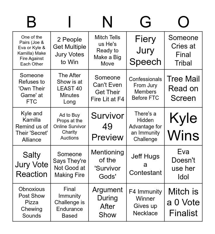 This bingo card has a free space and 24 words: Obnoxious Post Show Pizza Chewing Sounds, Someone Says They're Not Good at Making Fire, Someone Can't Even Get Their Fire Lit at F4, F4 Immunity Winner Gives up Necklace, Someone Cries at Final Tribal, One of the Pairs (Joe & Eva or Kyle & Kamilla) Make Fire Against Each Other, 2 People Get Multiple Jury Votes to Win, Mitch Tells us He's Ready to Make a Big Move, There's a Hidden Advantage for an Immunity Challenge, Kyle Wins, Kyle and Kamilla Remind us of Their 'Secret' Alliance, The After Show is at LEAST 40 Minutes Long, Jeff Hugs a Contestant, Eva Doesn't use her Idol, Someone Refuses to 'Own Their Game' at FTC, Final Immunity Challenge is Endurance Based, Argument During After Show, Fiery Jury Speech, Tree Mail Read on Screen, Salty Jury Vote Reaction, Ad to Buy Props at the Online Survivor Charity Auctions, Mentioning of the 'Survivor Gods', Confessionals From Jury Members Before FTC and Mitch is a 0 Vote Finalist.