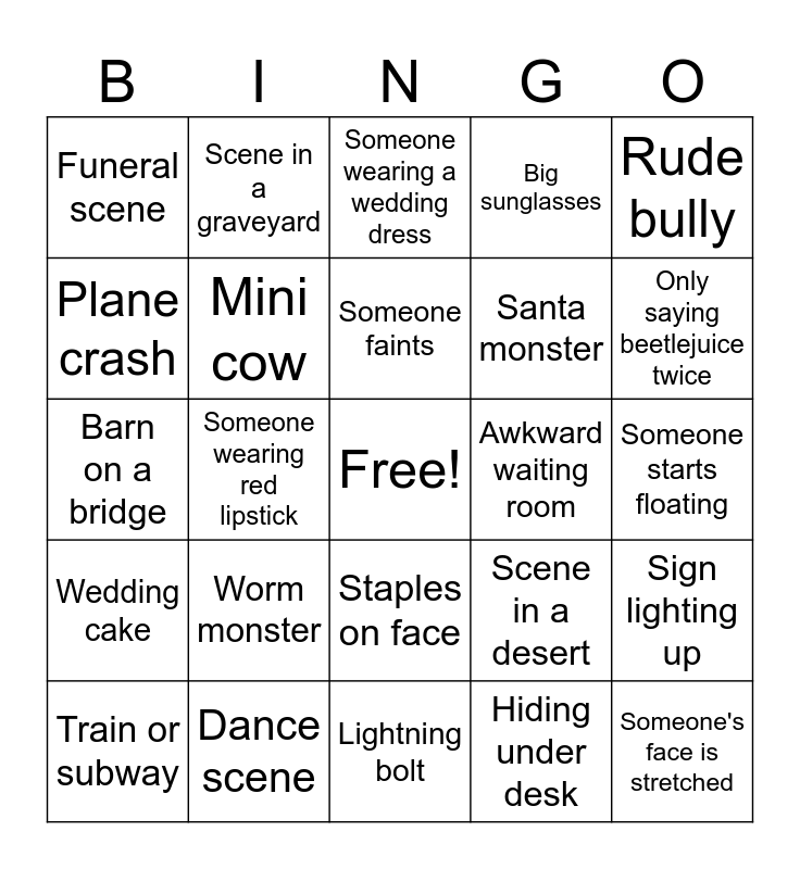 This bingo card has a free space and 34 words: Monster with small head, Hiding under desk, Scene in a kitchen, Someone's clothes start on fire, Wedding cake, Mini cow, Rude bully, Train or subway, Scene in a graveyard, Serious butler, Someone faints, Someone wearing a wedding dress, Hero saves the day, BOB, Awkward waiting room, Only saying beetlejuice twice, Dance scene, Barn on a bridge, Worm monster, Scene in a desert, Staples on face, Creepy house, Funeral scene, Someone starts floating, Lightning bolt, Someone's face is stretched, Big sunglasses, World's best boss mug, Santa monster, Plane crash, Eyes pop out, Someone wearing red lipstick, Sign lighting up and Red dress.