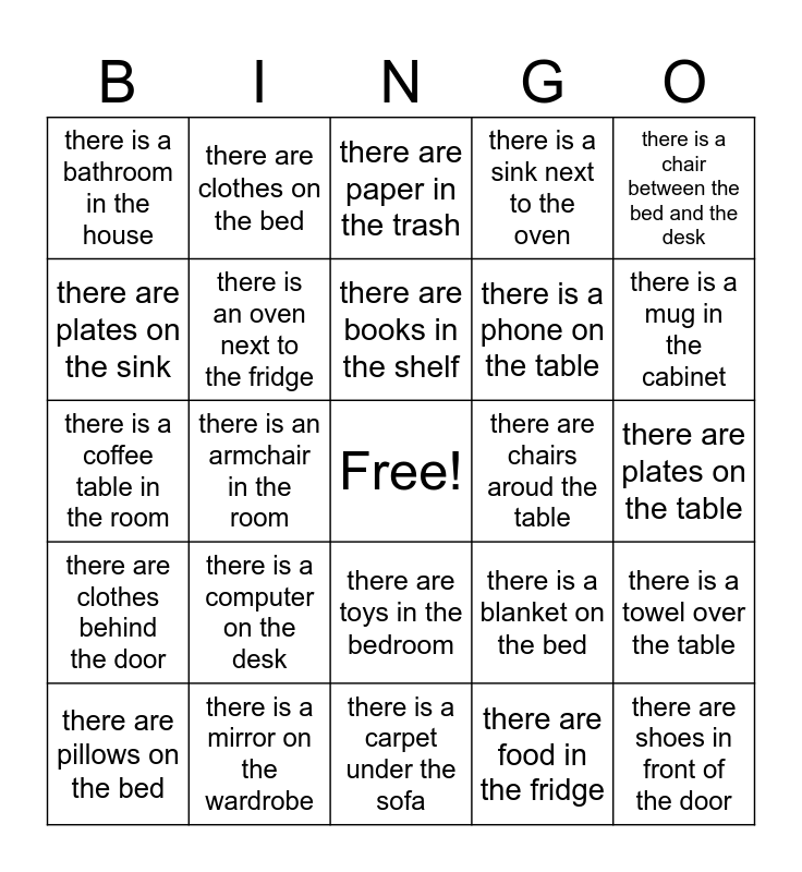 This bingo card has a free space and 24 words: there is a computer on the desk, there is a mirror on the wardrobe, there are books in the shelf, there are pillows on the bed, there is a chair between the bed and the desk, there is a bathroom in the house, there are plates on the sink, there are clothes on the bed, there are chairs aroud the table, there are toys in the bedroom, there is a phone on the table, there is a coffee table in the room, there is a blanket on the bed, there is a towel over the table, there is an oven next to the fridge, there are food in the fridge, there are plates on the table, there are paper in the trash, there is a mug in the cabinet, there is an armchair in the room, there are shoes in front of the door, there are clothes behind the door, there is a sink next to the oven and there is a carpet under the sofa.