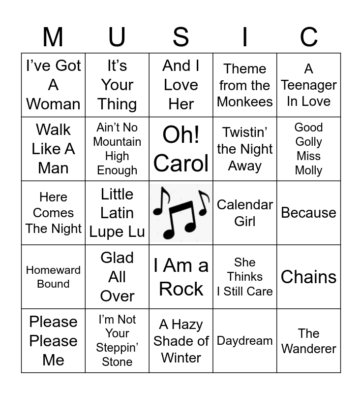 This bingo card has a free space and 60 words: I’m Down, I’m Not Your Steppin’ Stone, Boys, Homeward Bound, Daydream, Let’s Get it On, Ain’t No Mountain High Enough, You Send Me, Twistin’ the Night Away, Come On Let’s Go, Theme from the Monkees, Pleasant Valley Sunday, Walk Like A Man, Wouldn’t it Be Nice, I Can’t Stop Loving You, I’ve Got A Woman, The Wanderer, A Teenager In Love, Abraham, Maritn & John, Oh! Carol, Calendar Girl, And I Love Her, Please Please Me, Chains, Money Honey, Heartbreak Hotel, Hound Dog, Wild One, Good Golly Miss Molly, Rip It Up, The Twist, Limbo Rock, The Stroll, This Old Heart Of Mine, It’s Your Thing, Dream Lover, Teenager In Love, Little Latin Lupe Lu, Baby Please Don’t Go, Here Comes The Night, All I Really Want To Do, Glad All Over, Because, Can’t you See That She’s Mine, She Thinks I Still Care, I Fall To Pieces, Funny How Time Slips Away, Cryin’ Time, Make the World Go Away, I Am a Rock, A Hazy Shade of Winter, Draggin’ The Line, Mirage, Baby Love, You Keep Me Hangin’ On, I Can’t Help Myself, You Can’t Hurry Love, Little Deuce Coupe, Dance Dance Dance and Help Me Rhonda.