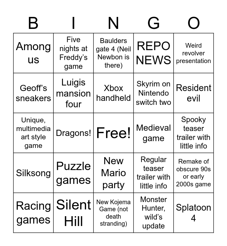 This bingo card has a free space and 24 words: Racing games, Puzzle games, Xbox handheld, Monster Hunter, wild’s update, Weird revolver presentation, Among us, Five nights at Freddy’s game, Baulders gate 4 (Neil Newbon is there), Medieval game, Spooky teaser trailer with little info, Unique, multimedia art style game, Luigis mansion four, Regular teaser trailer with little info, Remake of obscure 90s or early 2000s game, Geoff’s sneakers, Silent Hill, New Kojema Game (not death stranding), REPO NEWS, Resident evil, Silksong, Dragons!, New Mario party, Skyrim on Nintendo switch two and Splatoon 4.