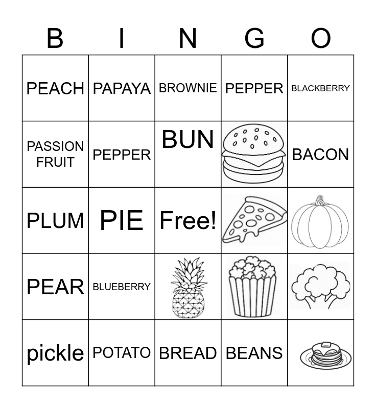 This bingo card has 7 images, a free space and 23 words: POTATO, BAGEL, PIE, BANANA, PEACH, BROWNIE, PEPPER, BREAD, BEANS, BUTTER, BACON, PEANUT, PEAR, BLUEBERRY, BLACKBERRY, PLUM, POMEGRANATE, PAPAYA, PASSION FRUIT, PEPPER, pickle, BUN and popsicle.
