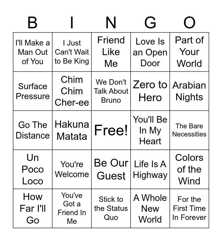 This bingo card has a free space and 24 words: You're Welcome, You've Got a Friend In Me, We Don't Talk About Bruno, How Far I'll Go, Part of Your World, I'll Make a Man Out of You, Surface Pressure, I Just Can't Wait to Be King, You'll Be In My Heart, Be Our Guest, Zero to Hero, Go The Distance, Life Is A Highway, Colors of the Wind, Chim Chim Cher-ee, A Whole New World, The Bare Necessities, Friend Like Me, Arabian Nights, Hakuna Matata, For the First Time In Forever, Un Poco Loco, Love Is an Open Door and Stick to the Status Quo.