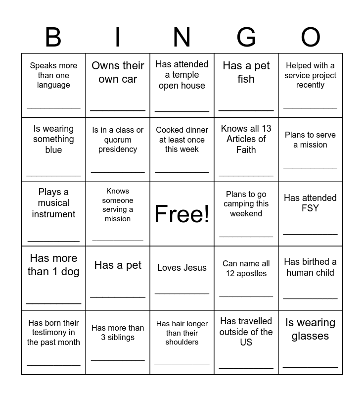 This bingo card has a free space and 29 words: Has born their testimony in the past month ____________, Is the oldest child _________, Knows someone serving a mission ____________, Has given a talk in sacrament meeting ____________, Speaks more than one language ____________, Has attended a temple open house ___________, Is in a class or quorum presidency ____________, Has a pet _________, Plans to go camping this weekend ____________, Has more than 3 siblings ____________, Has attended FSY ___________, Is wearing glasses _________, Has hair longer than their shoulders _____________, Has travelled outside of the US ___________, Plans to serve a mission ____________, Read scriptures yesterday ____________, Loves Jesus ___________, Has more than 1 dog _________, Helped with a service project recently ____________, Plays a musical instrument __________, Can name all 12 apostles ____________, Knows a hymn by heart ____________, Knows all 13 Articles of Faith ___________, Is wearing something blue ___________, Has a pet fish _________, Owns their own car _________, Has birthed a human child ___________, Cooked dinner at least once this week ____________ and Has read more than 10 books this year ___________.